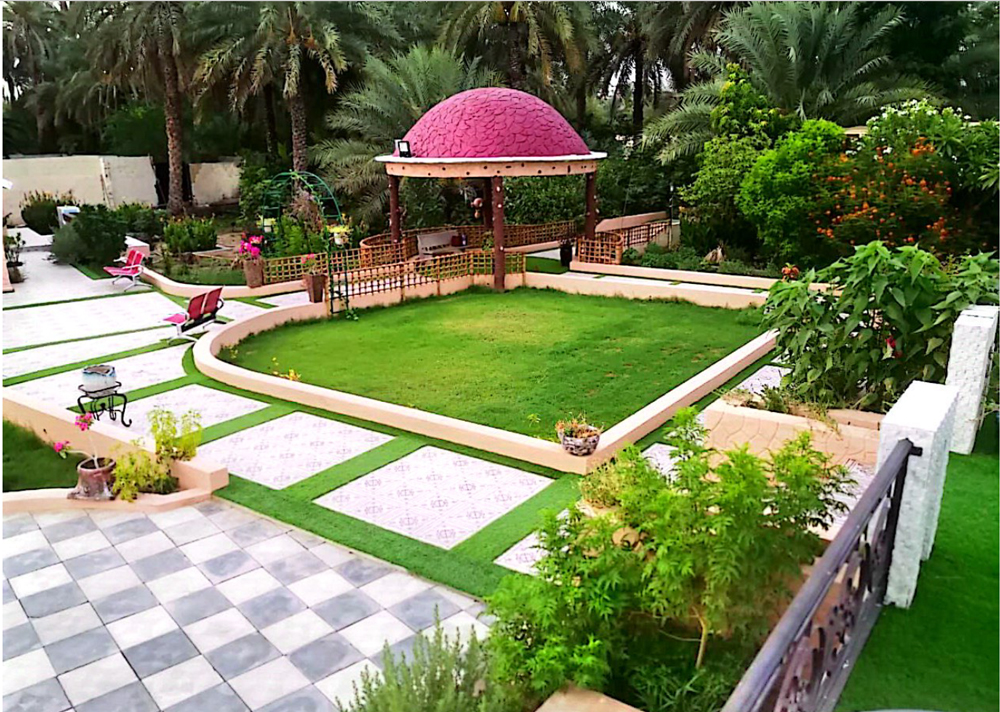 A beautiful retreat surrounded by palm trees and lush greenery, decorated pathways with cozy seating areas. It’s the perfect place to relax and enjoy peaceful moments with family and friends. - Green Lodge.